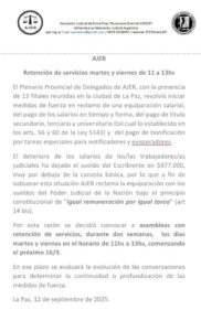 La Asociación Judicial de Entre Ríos (AJER) anunció medidas de fuerza que incluyen una retención de servicios de dos horas, los días martes y viernes, a partir del próximo 16 de septiembre. La decisión se tomó tras una reunión del Plenario Provincial de Delegados en La Paz, en la que se manifestó el «deterioro de los salarios» de los trabajadores judiciales.